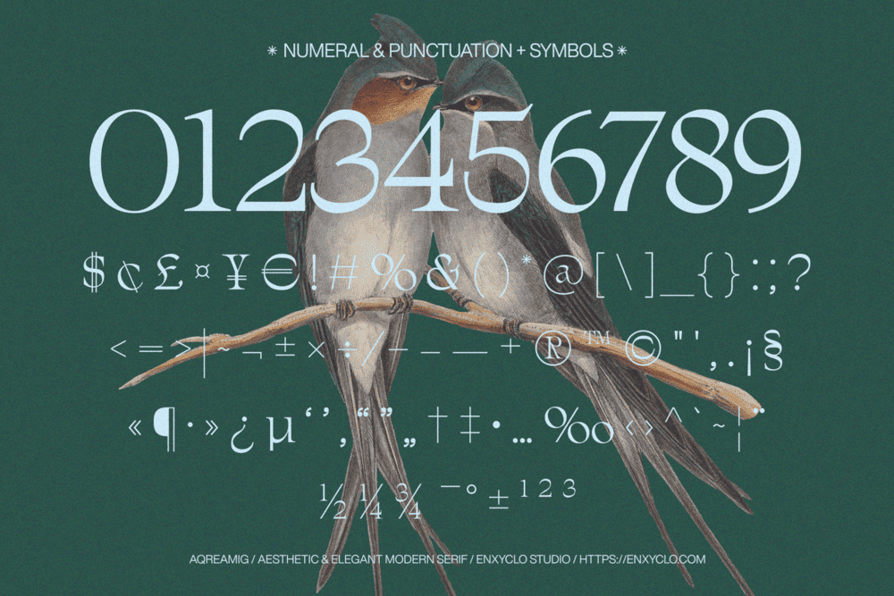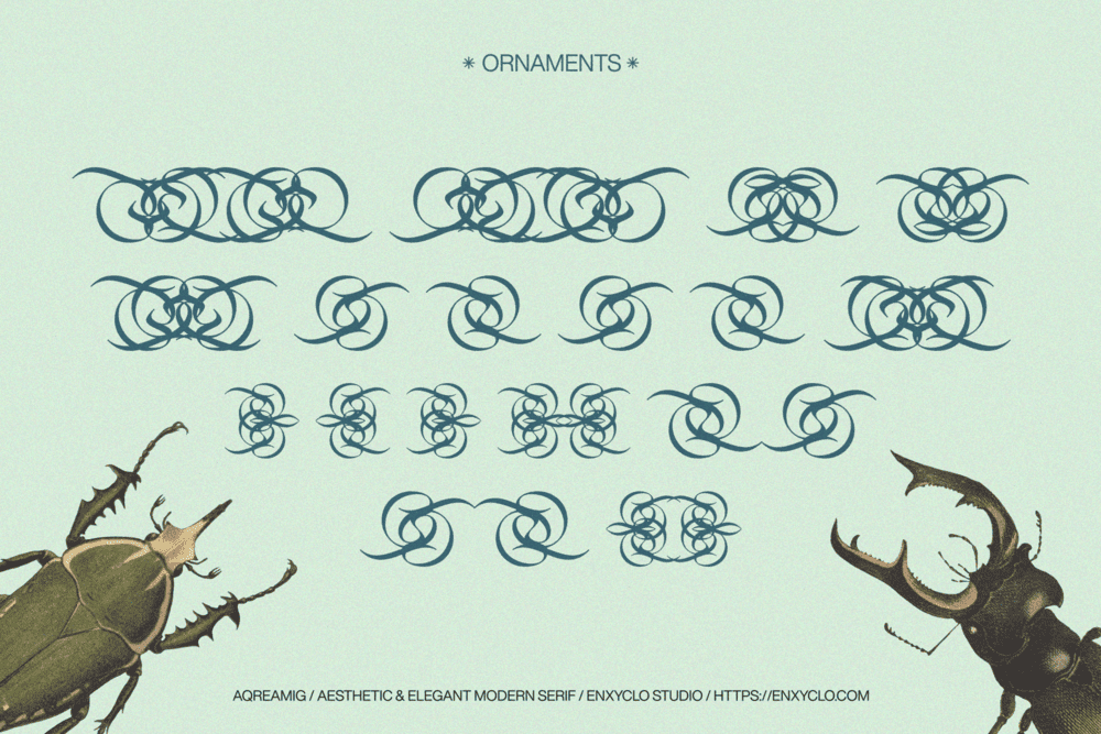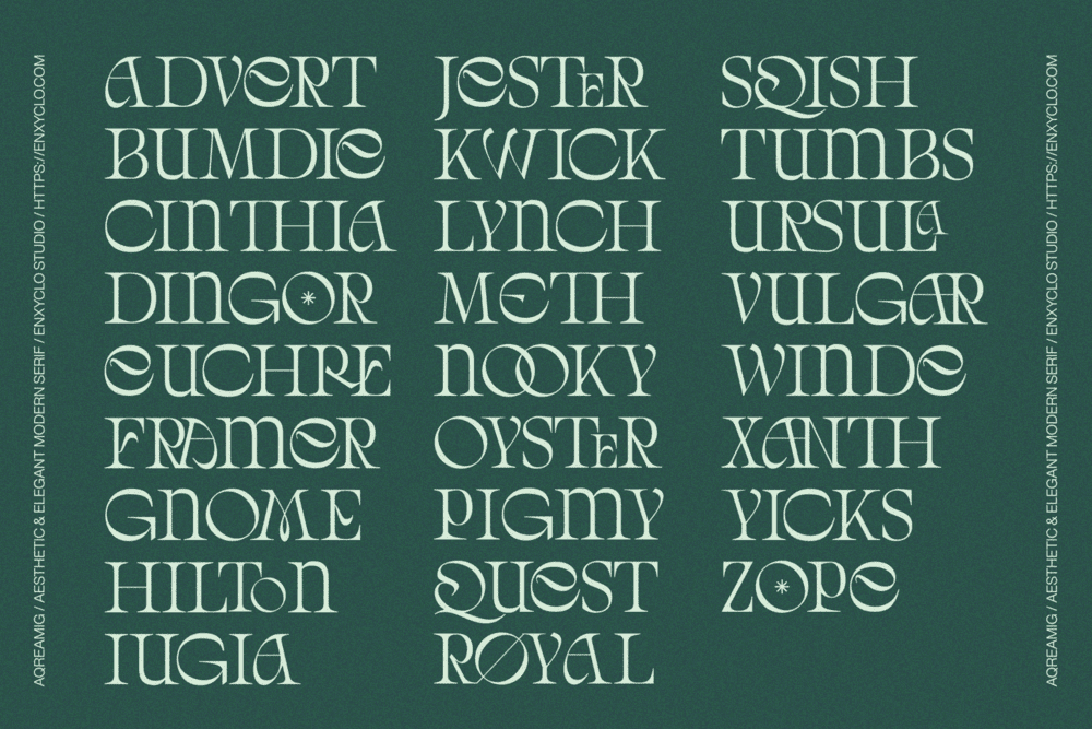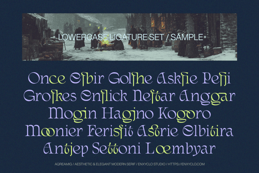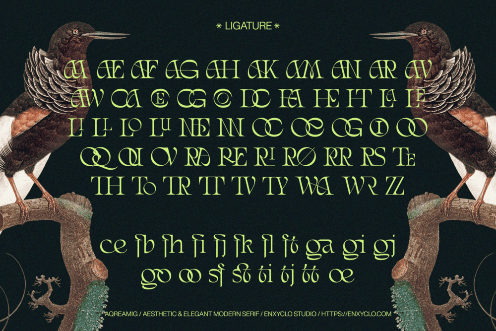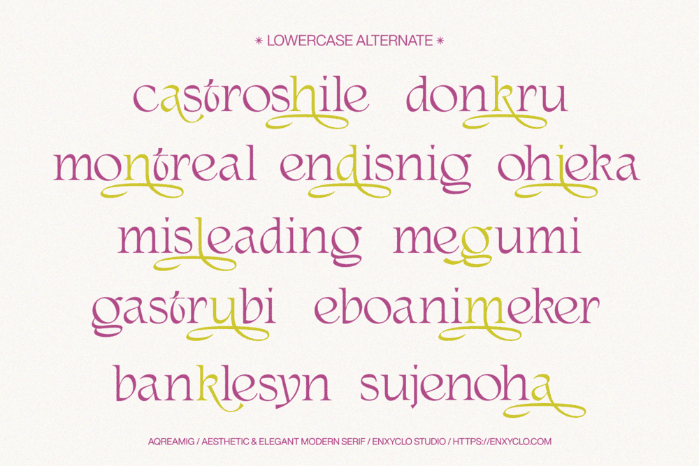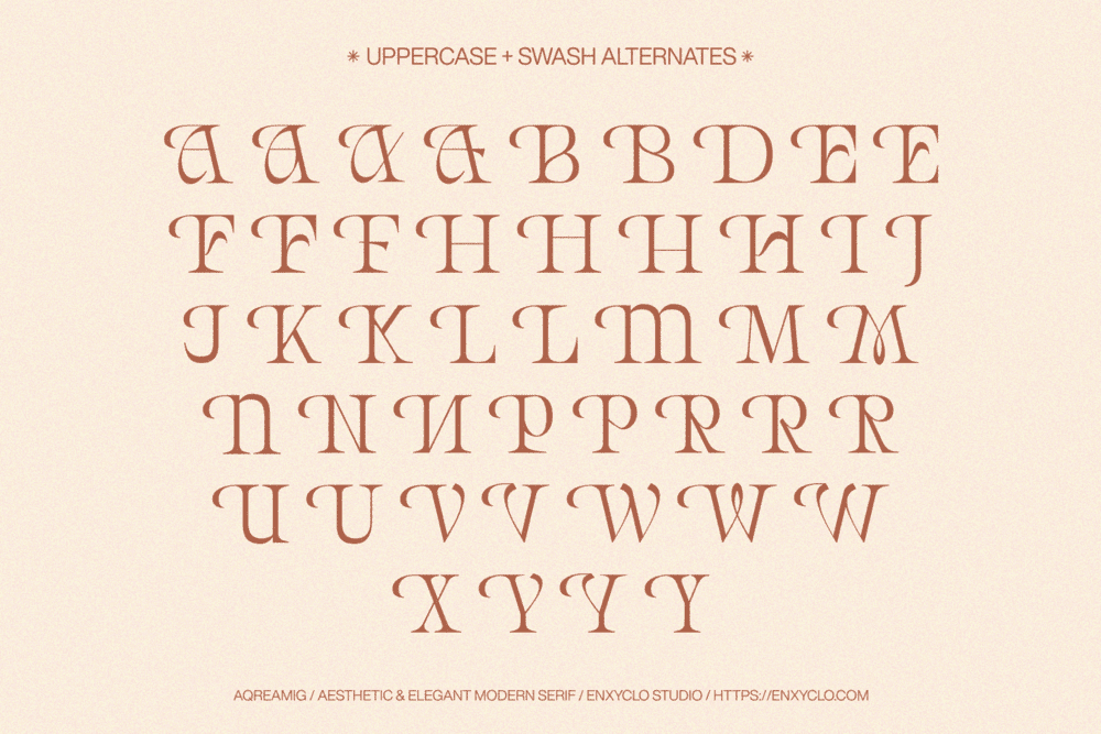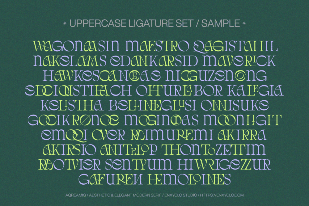 Aqreamig is an aesthetic and elegant modern ligature serif font. Flowing curves with sharp, angular accents, creating a striking balance between futuristic elements and subtle touches of nostalgia. This typeface embodies a classic and nostalgic feel while incorporating modern elements. With its elegant curves and unique variations, this font is perfectly suited for any creative project. It was purposely crafted to be used in large point sizes, although it doesn’t lose its magic in small point sizes. It is perfect for headline, digital ads, magazines, website, poster, branding, and logos. No matter the topic, this font will be an incredible asset to your fonts’ library, as it has the potential to elevate any creation. With this beautiful font, absolutely you can make your project stand out from the rest.