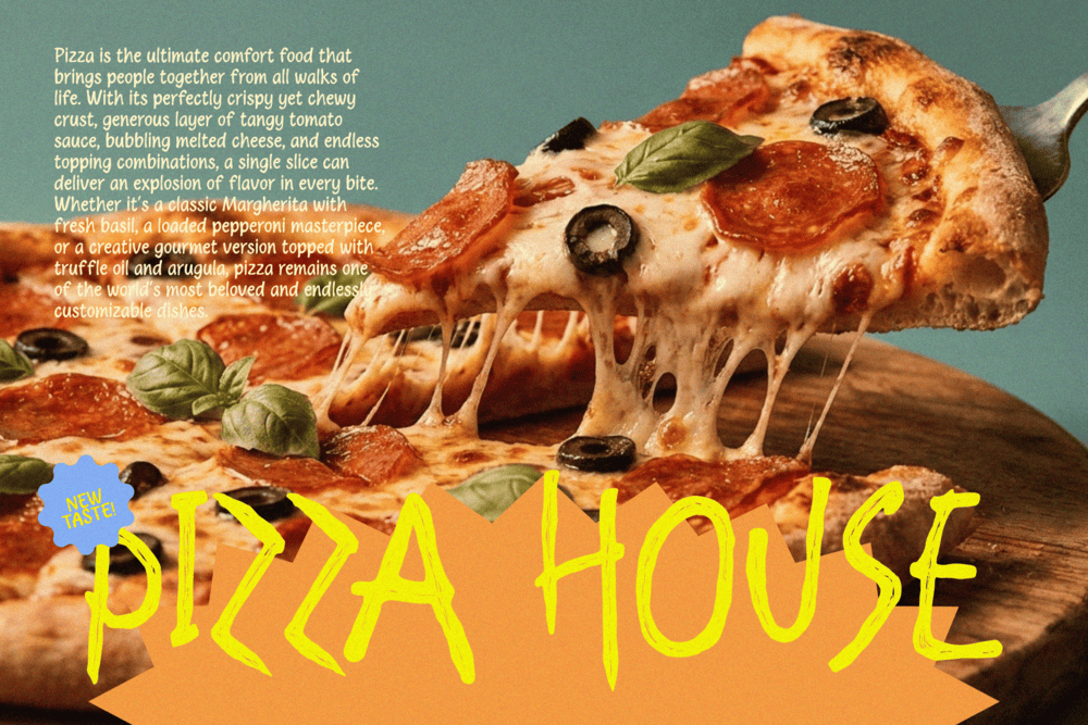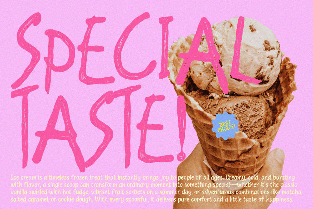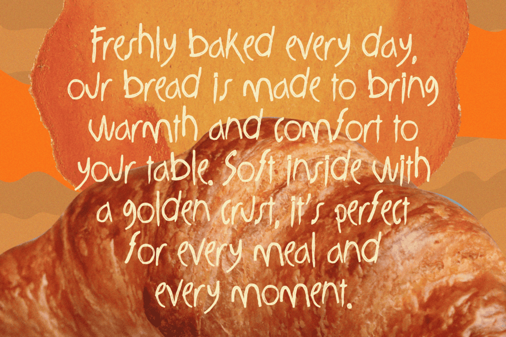 Creamy Sauce is a mouth-watering handwritten food font crafted to capture the lively, cozy chaos of a real kitchen. Inspired by food and beverage culture, its raw, imperfect letterforms feel warm, friendly, and handcrafted—just like comfort food made with love. Every character is infused with the joy of freshly baked bread, croissants, sourdough, and baguettes, blended with the playful energy of pizza, sushi, donuts, coffee, milkshakes, and matcha moments. The result is a font that feels juicy, delicious, and irresistibly inviting—designed to spark appetite at first glance. With its playful personality and welcoming vibe, Creamy Sauce is perfect for food brands that want to feel approachable, cheerful, and full of flavor. Whether you’re designing menus, café logos, packaging, or mouth-watering posters, this font adds warmth, character, and a delicious sense of storytelling to every visual.