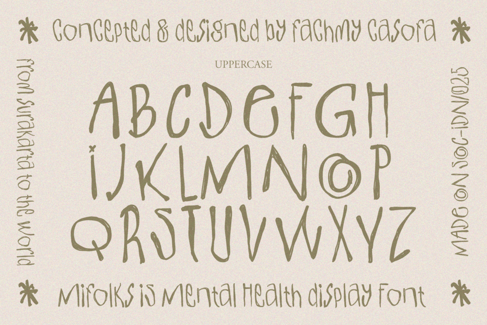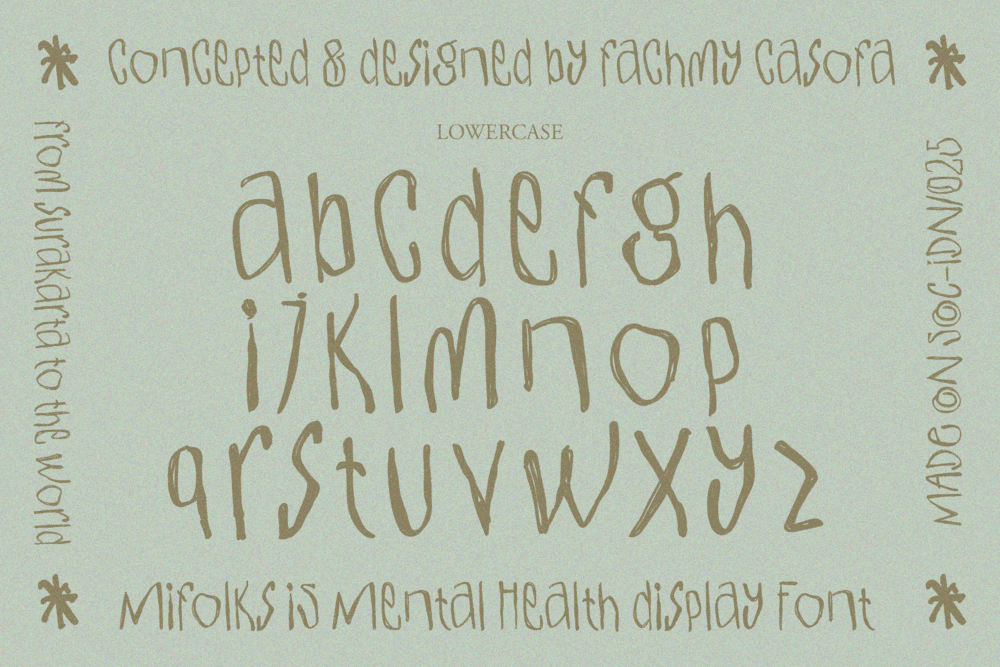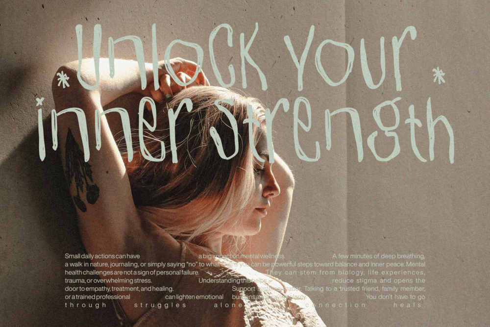 MIFOLKS is a deeply expressive, handwritten font with a deliberately rough and organic texture, designed to resonate with the raw, authentic emotions tied to mental health, mindfulness, and spiritual growth. Its imperfect, brush-like strokes mirror the human journey — full of texture, vulnerability, and strength — making it the ideal typographic companion for projects that seek to foster connection, healing, and self-awareness. Whether you’re designing a mental health awareness campaign, a mindfulness journal, or a spiritual wellness brand, MIFOLKS brings a soulful, hand-crafted voice that speaks directly to the heart.