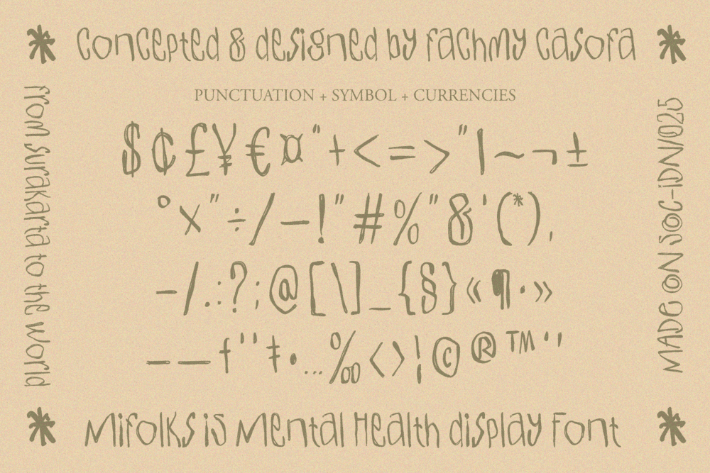 More than just a font, MIFOLKS is a visual embrace for the mind and spirit. Its rugged yet graceful letterforms invite contemplation, reflection, and emotional honesty — perfect for headlines, social media quotes, and therapeutic branding materials. With its comprehensive character set including uppercase, lowercase, punctuation, symbols, and currencies, MIFOLKS is built to support global mental health initiatives, ensuring your message of compassion and resilience reaches every corner of the world.